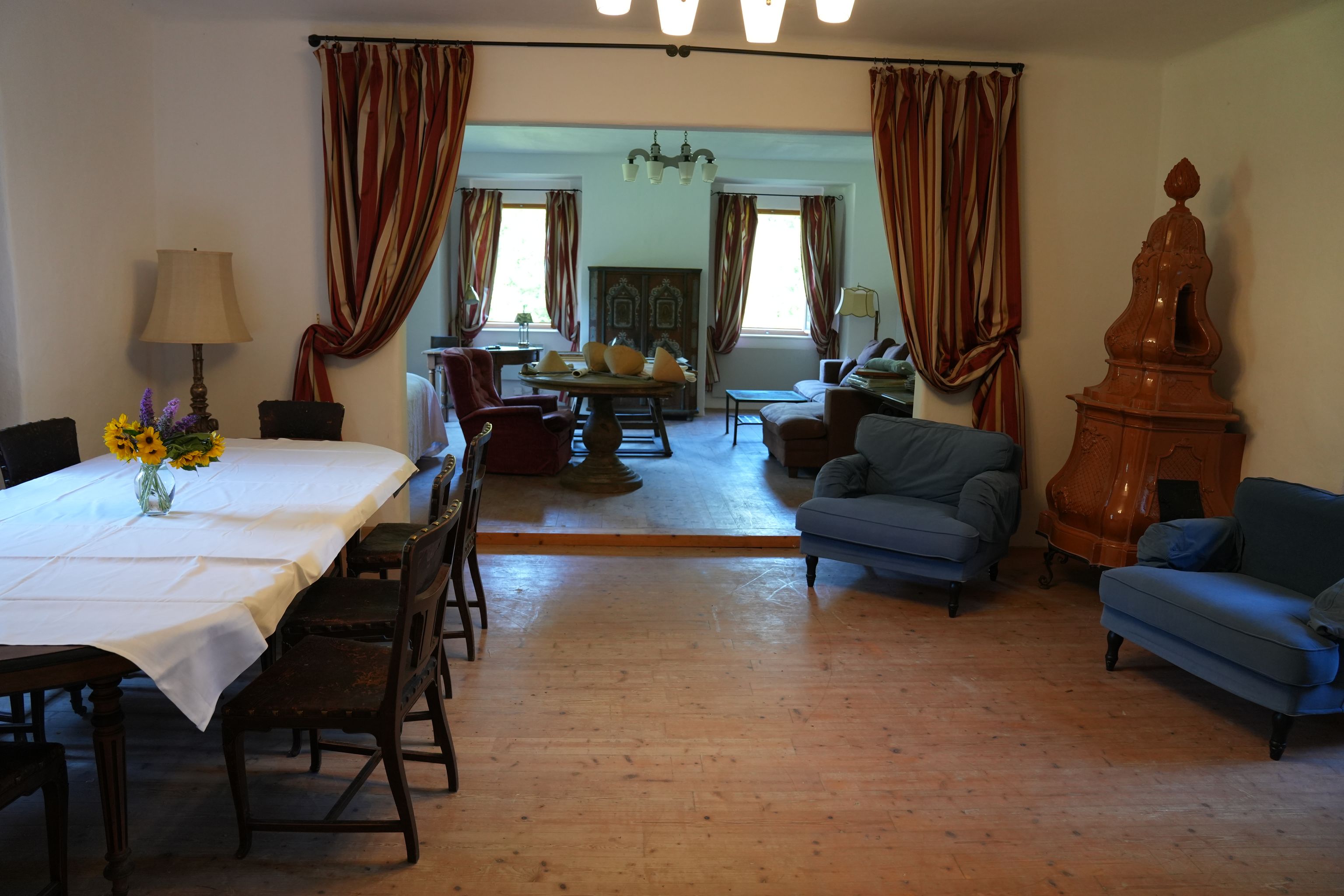 Im Inneren erwartet Gäste ein beeindruckender Renaissancebau mit jahrhundertealtem Charakter. Neun liebevoll eingerichtete Schlafzimmer bieten Platz für Übernachtungen im historischen Ambiente. Eine große Küche, ein Speisezimmer mit langer Tafel und ein stilvoller Salon schaffen warme Aufenthaltsbereiche. Der 120-m²-Saal mit antikem Ziegelboden kann durch Deckenbeamer in jede gewünschte Stilrichtung verwandelt werden.